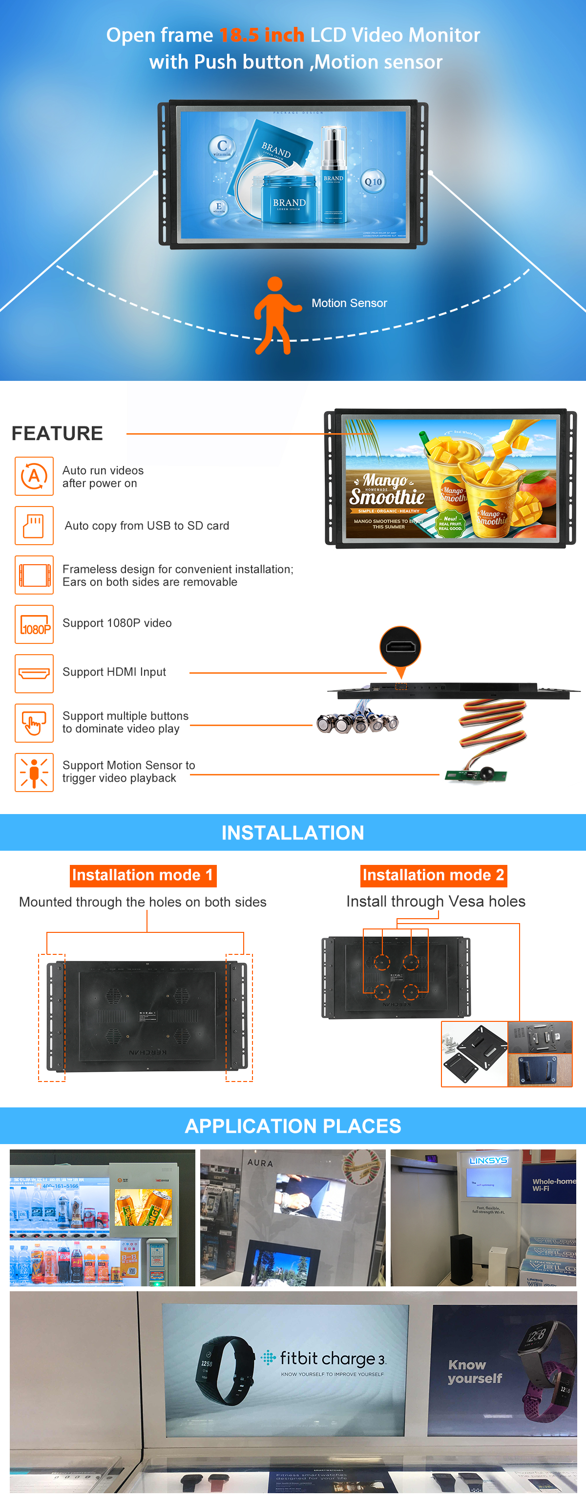 Compact Structure Open Frame LCD Screen Wall Mount Black Color Standard